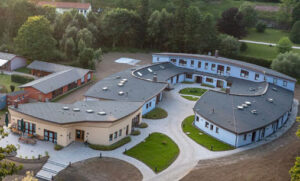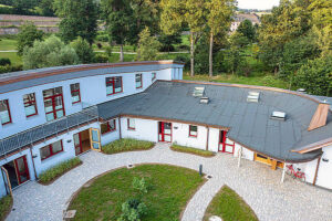 Gebaut wurde nun ein Gebäudeensemble für barrierefreies Wohnen mit zwei Bereichen für je acht Menschen mit Hilfebedarf, zwei Kurzzeitpflegeplätze sowie zwei Wohnungen für Hausverantwortliche und Mitarbeitende. Hier werden mehrheitlich ältere Menschen leben, aber auch jüngere, die einen barrierefreien Wohnplatz brauchen. Hinzu kommen weitere Bereiche, etwa ein Raum der Stille, der als Aufbahrungsraum letzte Begegnungen und Verabschiedungen ermöglichen wird, sowie ein Therapieraum. In einem eigenen, angrenzenden Gebäudeteil sind neue Räume für die Tagesbetreuung Kon-Tiki entstanden, die vorher im Gutshof des Schlosses Stockhausen untergebracht war.